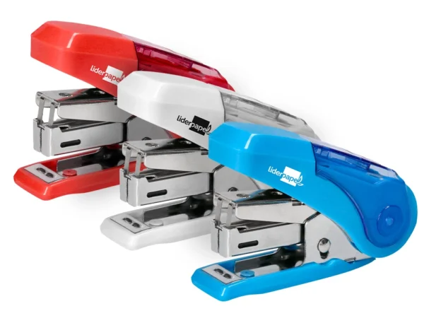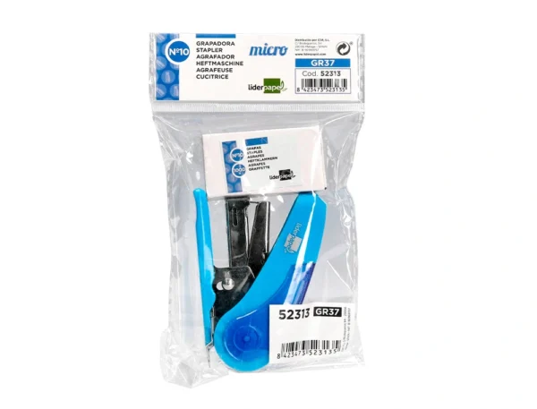 Agrafador fabricado em plástico com mecanismo metálico. Usa agrafes nº10. Profundidade do agrafado a 3 cm da margem da folha. Carga 1 pente (50 agrafes). Inclui caixa de 1000 agrafes. Incorpora saca agrafes traseiro. Cores sortidas: azul, branco e vermelho. Comprimento da base: 90 mm. Medidas: 30 x 50 x 90 mm. O agrafador.