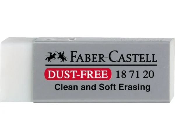 A série Faber-Castell Dust-Free Eraser oferece o melhor desempenho em apagamento limpo. Também não contém plastificante nocivo – Ftalato. A fórmula única “Dust-Free” torna o apagador macio e garante um excelente apagamento limpo e sem manchas. A sobra e o pó do apagador se enrolam facilmente para facilitar a limpeza. A borda de conforto (cantos chanfrados) é trabalhada com cuidado para um desligamento preciso e para evitar quebras. Além disso, as borrachas são livres de látex e dermatologicamente testadas e aprovadas.