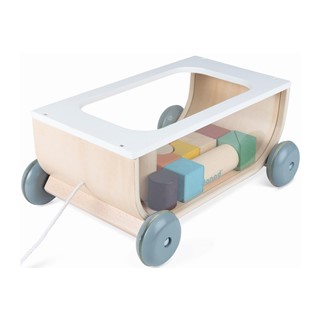 Jogo em madeira, com pintura a água . O jogo 2 em 1: é um jogo de construção com 17 cubos e um carro de puxar por uma corda, perfeito para dar os primeiros passos. As costas do carro são transparentes para ver com mais precisão as cores e as formas dos cubos .