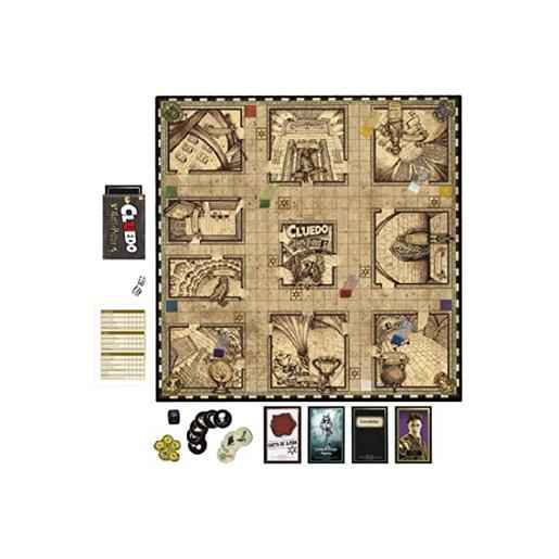 Harry Potter – Cluedo – Jogo de mesa, o clássico Cluedo agora inspirado em Harry Potter. Inclui tabuleiro de Hogwarts com movimento, 6 peões, 93 cartas, 6 fichas de suspeito, 6 fichas de objeto, 40 fichas de pontos de casa, 2 dados standard, 1 dado Hogwarts, bloco de notas, folha de adesivos e instruções. Procura pistas para resolver o mistério que ameaça aos magos de Hogwarts. Quem fez desaparecer o estudante? Que feitiço ou objeto foi utilizado? Onde foi atacado o estudante