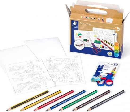 O conjunto de papelão contém 6 lápis de cor Noris jumbo em cores sortidas, 1 lápis de grafite Noris jumbo, tesouras Noris hobby e adesivos com motivos divertidos