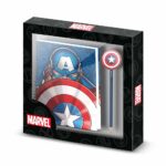 Embalagem com lápis e agenda de capa dura fechada com chave, apresentada em caixa oferta. Lápis decorativo com silhueta superior.