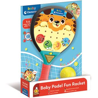 Uma raquete de padel interativa com uma bola de borracha macia. A raquete é também um centro de atividades eletrónico que ensina os números e as primeiras palavras, convidando a criança a imitar os movimentos do praticante de padel com canções e rimas. O aro da raquete e a bola são de plástico macio resistente aos choques. A criança pode jogar livremente ou praticar a batida na bola, fixando-a à raquete com o elástico.