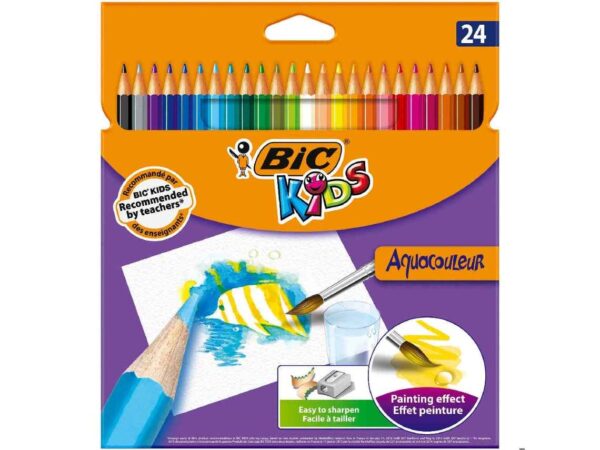 Os lápis aquareláveis BIC® Kids Aqua possuem grafite grande e pigmentada com grande poder de cobertura. Quando mergulhadas na água, as minas dão um efeito aquarelado aos desenhos. Use um pincel para amplificar o efeito. Disponível numa paleta de 24 cores brilhantes, estes lápis de cor permitem todos os tons e asseguram sempre uma finalização incrível. A mina de qualidade é fácil de dimensionar, para coloração infinita. O corpo hexagonal é fácil de segurar e não rola.