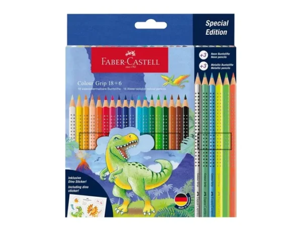 Conteúdo: 18 lápis de cor Color Grip em cores padrão + 3 lápis de cor metálicos + 3 lápis de cor neon + adesivos DINO