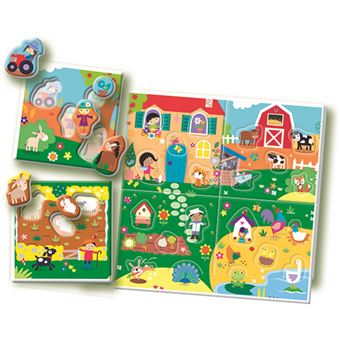 Jogo educativo para explorar a quinta, onde a criança classifica objetos e animais em ambientes como estábulo e galinheiro, utilizando 6 cartões-ambiente e 30 peças ilustrativas.