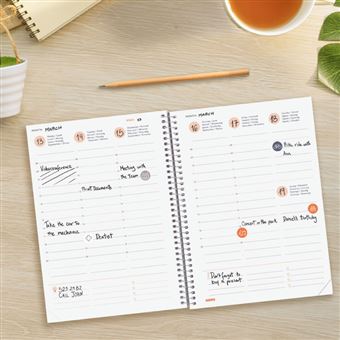 Agenda espiral com capas leves feitas de polipropileno reciclado, proveniente de resíduos marinhos e poluição. Ideal para organizar o ano com 16 meses completos: começando em setembro de 2025 e terminando em dezembro de 2026. Com elástico e cantos microperfurados para localizar rapidamente o dia/semana atual