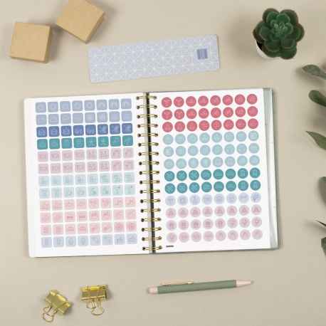 Agenda de capa dura com detalhes em folha metálica. Possui encadernação em espiral dupla e elástico macio. Possui abas mensais coloridas e recortadas para fácil acesso ao mês desejado. A agenda OPTIMAL apresenta um design minimalista com cores suaves e vibrantes. Inclui seções úteis para acompanhamento de metas e um rastreador de hábitos, além de uma agenda mensal em formato de grade. Inclui também acessórios essenciais: um conjunto de marcadores de página, uma capa transparente e adesivos temáticos. A OPTIMAL é uma agenda moderna, útil e estilosa.