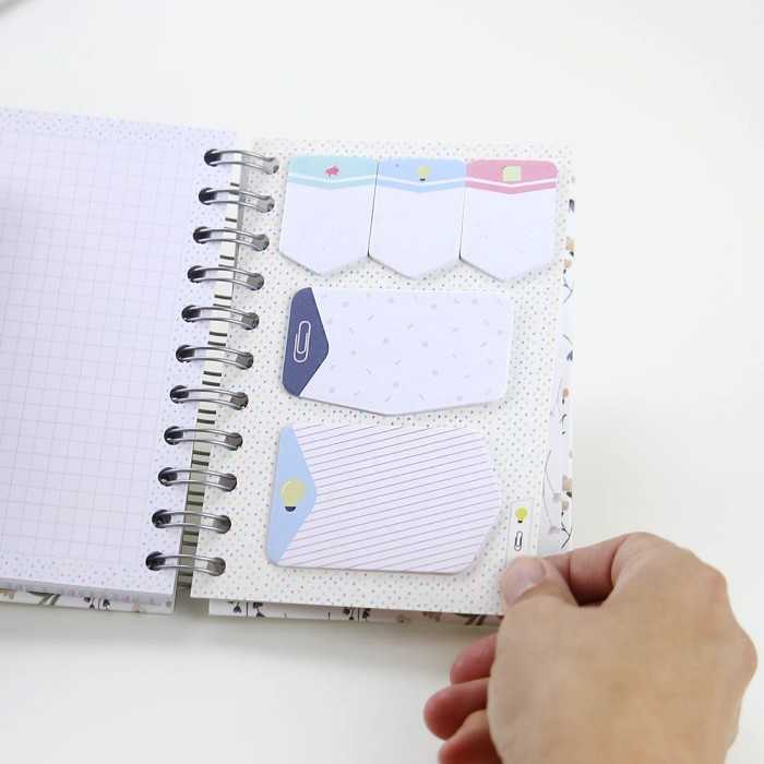 Caderno A6, com separador e post-it com motivos.