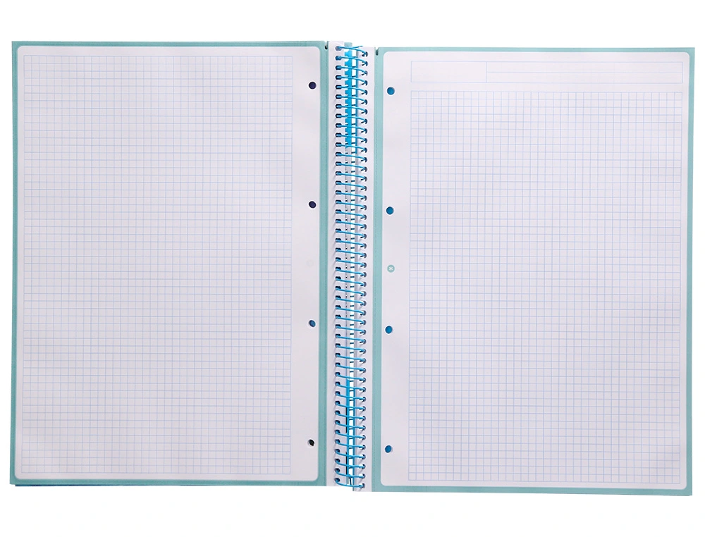 Capa de cartão colado de 135 g/m², forrado a uma face com papel mate extra suave e reserva de verniz uvi. 80 folhas. Grande resistência e rigidez. Papel extra branco de 90 g/m². Espiral nylonizada da cor da capa. Coil-lock.