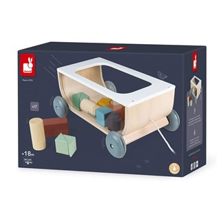 Jogo em madeira, com pintura a água . O jogo 2 em 1: é um jogo de construção com 17 cubos e um carro de puxar por uma corda, perfeito para dar os primeiros passos. As costas do carro são transparentes para ver com mais precisão as cores e as formas dos cubos .
