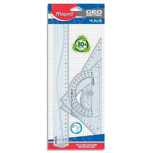 Conjunto composto por: 1 x régua 300 mm, 1 x esquadro 60° 210 mm, 1 x esquadro 45° – 210 mm, 1 x transferidor 180° – 120 mm