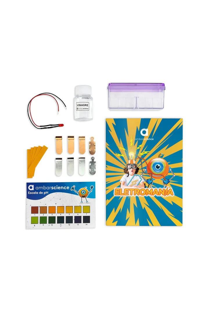 Experimenta o poder das reações químicas com estas incríveis experiências para gerar eletricidade. Inclui vinagre, papel indicador, escala de pH, caixa, 4 placas de cobre, 4 placas de zinco, lâmpada LED, fio de ligação e manual educativo.