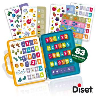 Mala de plástico que contém no seu interior 15 fichas com exercícios de cálculo aritmético e 90 peças de plástico com números e sinais matemáticos. Uma vez guardadas no seu local, as fichas não caem. O encaixe de cada ficha faz com que apenas se possa colocar esta no local correto. Inclui ainda um manual de instruções. Colocando corretamente as fichas dos números nas folhas, as crianças aprenderão as suas primeiras operações matemáticas simples.