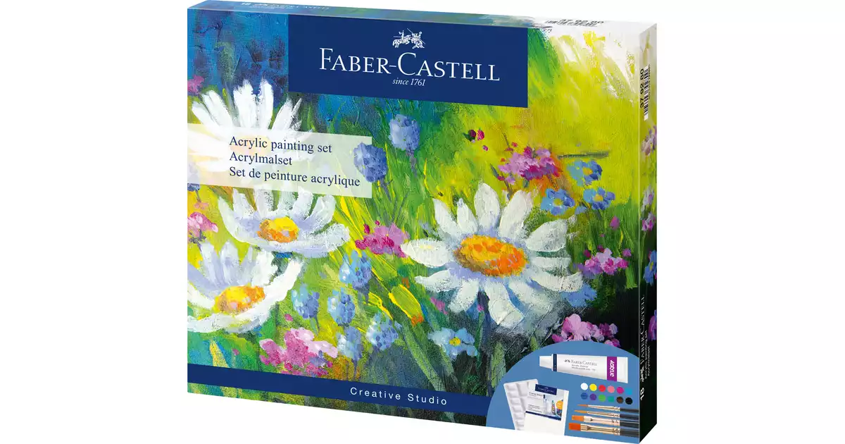 Este kit inclui 12 tubos de tinta acrílica de 9 ml, 4 pincéis sintéticos, 1 tela de 20 x 25 cm e 1 paleta.
