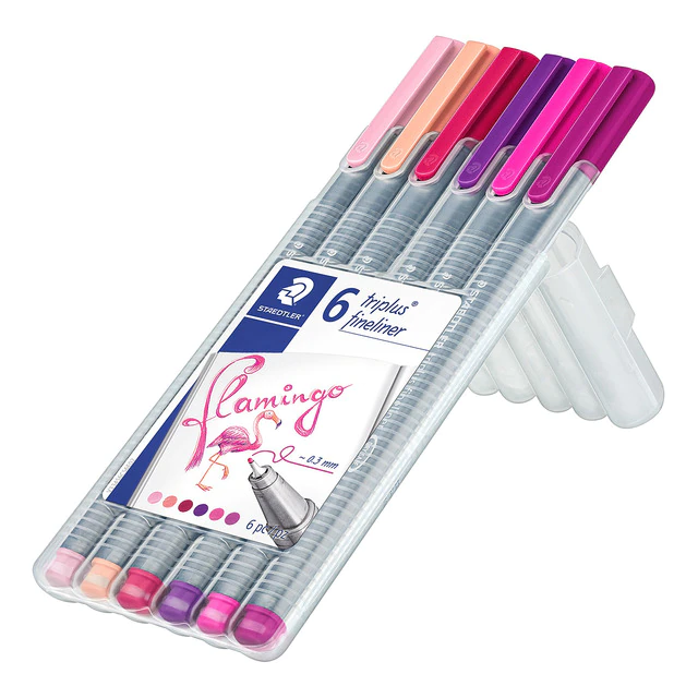 Revestimento fino Staedtler triplo em formato triangular ergonômico para escrita fácil e descontraída. Cofre a seco – pode ser deixado sem tampa por dias sem secar Pacote variado de seis revestimentos finos, com uma ponta fina revestida de metal e uma largura de linha de aproximadamente 0,3 mm. A tinta à base de água lava muitos tecidos. Vida útil longa do barril PP. 6 cores Flamingo.