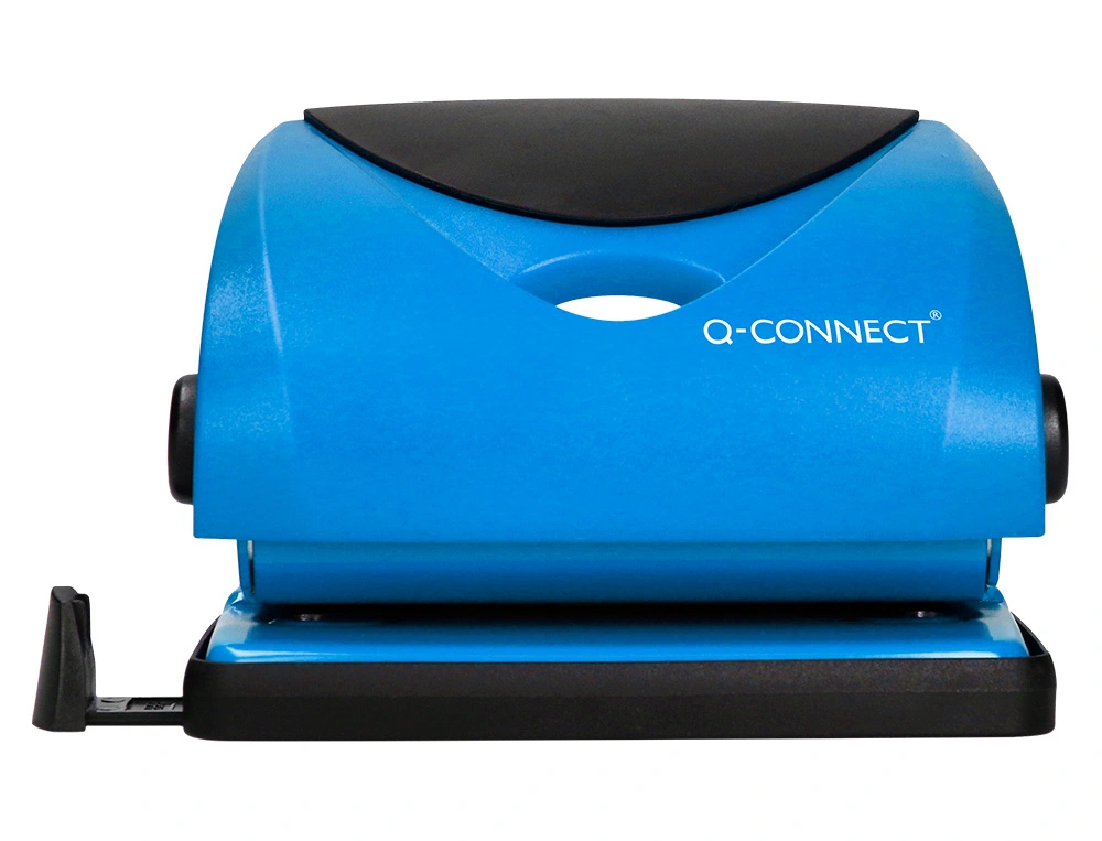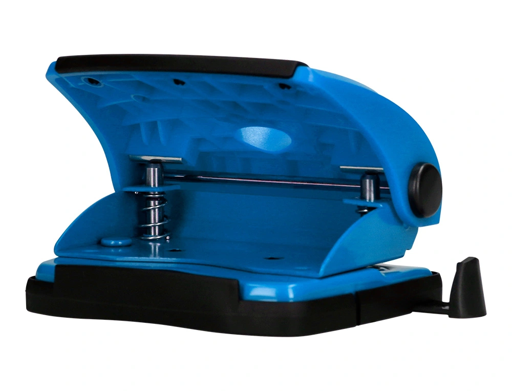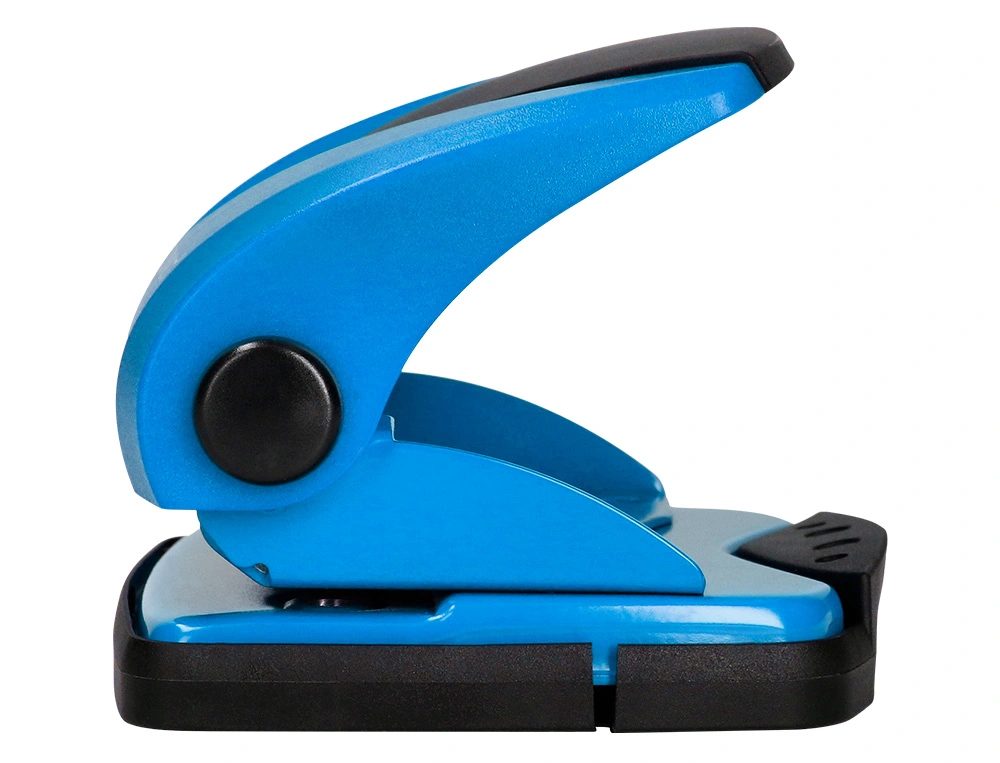 Parte superior de plástico e base metálica, com tampa inferior antideslizante de plástico. Abertura de 2 mm com capacidade para perfurar 20 folhas. Com guia ajustável para alinhar o papel. Medidas da base: 99 x 80 mm. O furador.