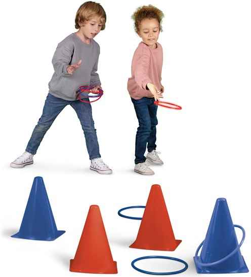 Jogo de arremesso de argolas da coleção Party Time. O jogo consiste em lançar as argolas com precisão para que caiam nos cones que dão mais pontos.