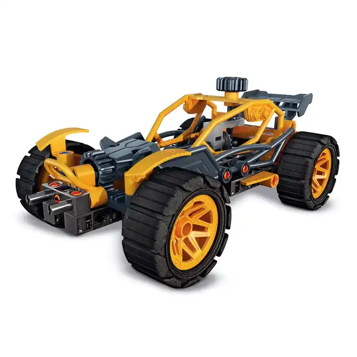 O kit contém mais de 100 peças para construir 2 modelos diferentes equipados com mecanismos de transmissão.