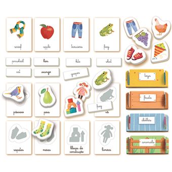 Um jogo para aprender as primeiras palavras em inglês de acordo com a pedagogia Montessori. Contém: 24 objetos com formas, 24 cartas frente e verso com nomes em português e inglês, 24 cartas em inglês e 4 caixas para montar e classificar os objetos por categorias.