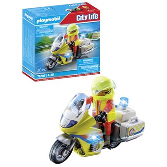 Este set da PLAYMOBIL irá encantar todos os profissionais de resgate dedicados. Com a ágil mota de resgate com luz intermitente, o médico de emergência chega à cena para ajudar em pouco tempo. A mota está equipada com uma luz intermitente que pode ser ligada através de um botão. Para garantir o fácil trajeto no tráfego rodoviário agitado, o veículo de duas rodas pisca não apenas na parte de trás da caixa da mota, mas também alternadamente em ambos os lados. Depois de 60 segundos, a luz apaga-se sozinha. Os acessórios médicos podem ser arrumados e transportados no estojo do médico. Para os primeiros socorros no local de um acidente, ligaduras e sacos de reanimação estão incluídos. Um set de alta qualidade para crianças a partir dos 4 anos.O set consiste numa figura da PLAYMOBIL, uma mota de resgate, capacete, luvas, máscara facial, caixa do médico e outros extras emocionantes. Os acessórios luvas, capacete e máscara facial são removíveis. A série PLAYMOBIL City e Life inclui veículos modernos e modelos realistas com os quais as crianças podem aprender através do brincar e desenvolver habilidades importantes.