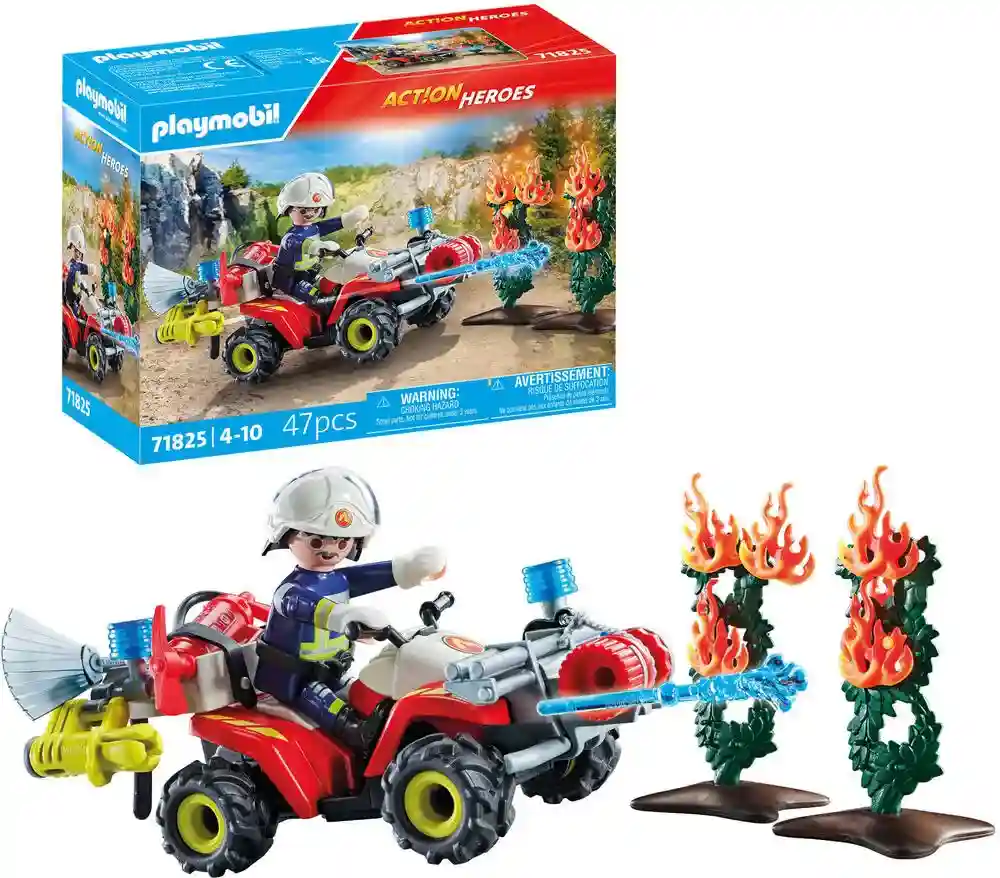 Entra na ação com o PLAYMOBIL Quad dos bombeiros! Equipado com guincho e canhão de água, este quad está pronto para missões ousadas. A figura do bombeiro pode montar no quad e agarrar o guiador, enquanto as ferramentas como o extintor e o machado são firmemente presas à parte traseira. As chamas são presas nos arbustos para que as crianças possam recriar os seus próprios resgates.