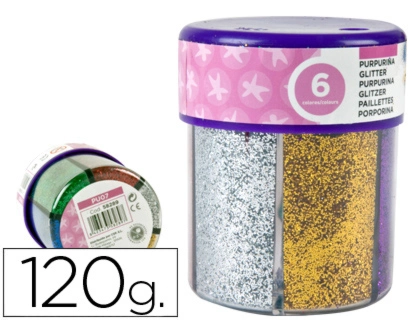 Purpurina fantasia cores metálicas: azul, ouro, prata, vermelho, verde e violeta. Ideais para trabalhos manuais. Recomendadas a partir dos 3 anos de idade. Frasco de 120 g.